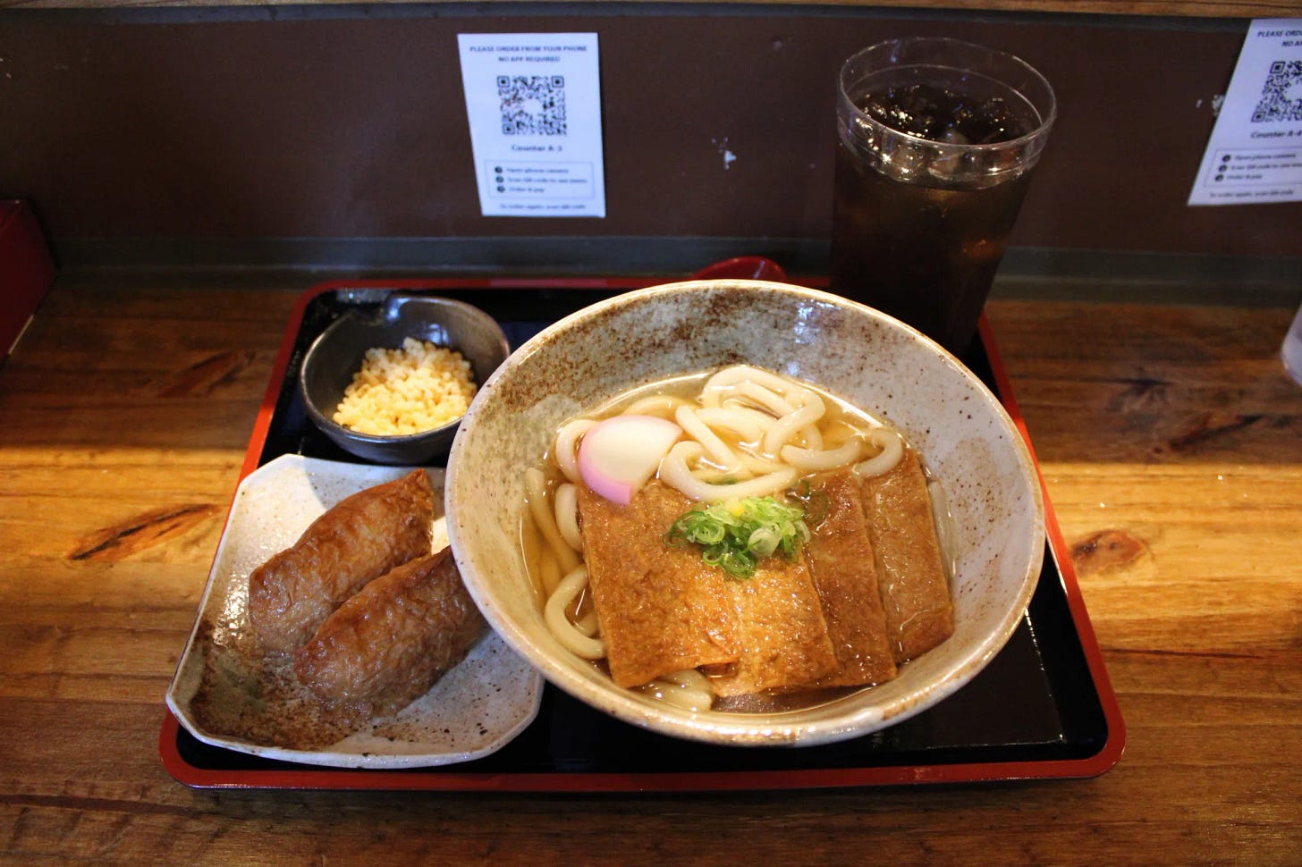 After luckily snagging the last two spots at the counter, my friend and I placed our orders through a QR menu. Within what felt like seconds, trays of piping-hot udon appeared before us. I got the kitsune udon, topped with a heap of scallions, fish cake and pieces of fried tofu skin, which soaked up the flavors of the rich, umami dashi broth. Unsurprisingly, the noodles were the star: bouncy with a slight chewiness. I opted to get a side of tempura crunch after remembering an udon spot I went to in Tokyo that left containers of the fried batter out on the counters, which added a lovely crunch to an otherwise texturally-delicate dish.