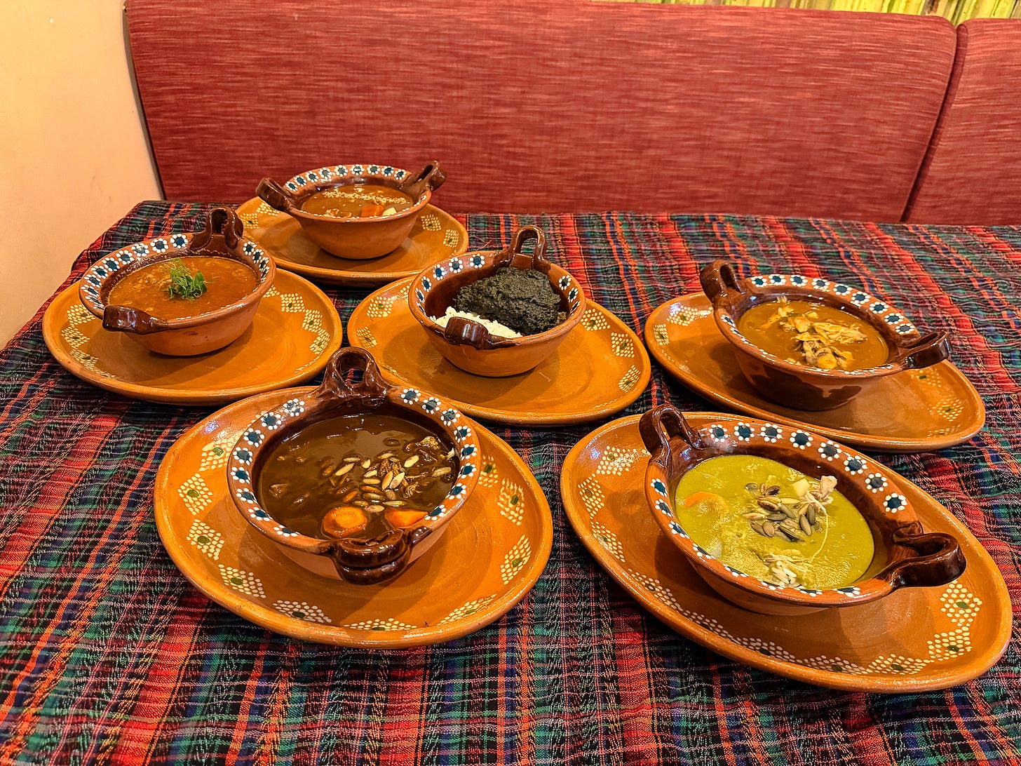 Luckily, we can taste at least 5 of these recados right here in Brooklyn. To help me understand, Jorge lines up a tasting flight for me, five bowls arranged like a spectrum. Seeing them together makes the concept click. The recado exists just briefly—before it becomes a plated dish.