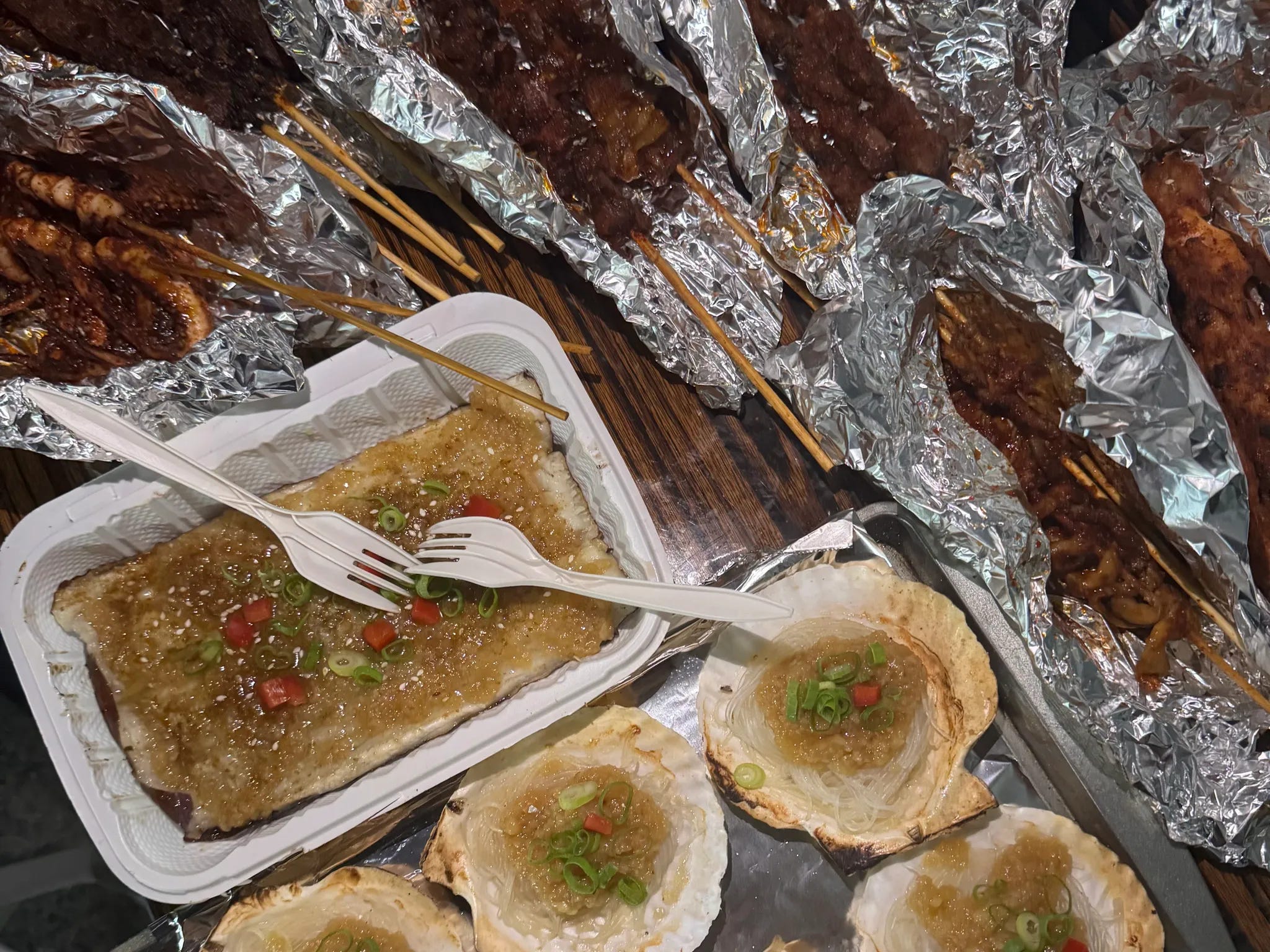 The menu is long, and starting at two dollars a skewer, you won’t break the bank trying everything your heart desires. Beef and lamb are the classic options, but other favorites of mine include enoki mushrooms, grilled with a sweet paste brushed on; beef tendon skewers, savory and gelatinous, which I think pair perfectly with the beef skewer (take a bite of each for the ideal mouthfeel); and chicken gizzard, sweet and crunchy with no organ funk. There are squid skewers, either chopped up or just the tentacles, full of smoky flavor, and grilled garlic eggplant: Chinese eggplant butterflied and topped with a sweet garlic blend, so soft it pulls apart like noodles. Seafood might not be your first thought, but their char-grilled oysters and scallops, served on the shell and topped with cooked vermicelli rice noodles and the same garlic blend will have you reconsider all your preconceptions. Adrian might come over with some slices of complimentary watermelon that he cuts himself when he’s not inundated with orders from the never ending line.