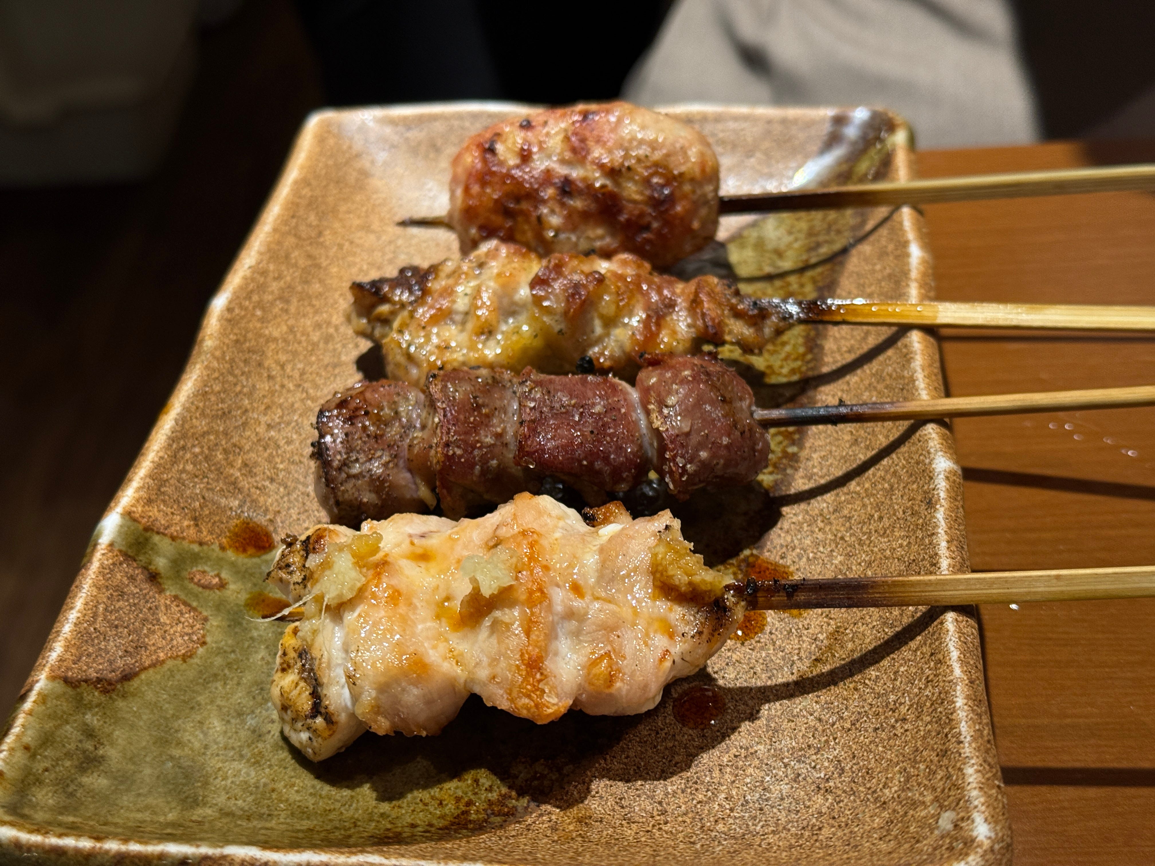 There are no English menus, but Google Translate works well enough. On the back of one menu is a yakitori list; on my visit, there was a young woman manning the charcoal, intensely focused on grilling each piece to perfection. Hand-written specials hang on the walls with their prices. I ordered the fried new potatoes with mentaiko, shrimp with mayonnaise, and the chef’s choice of yakitori.